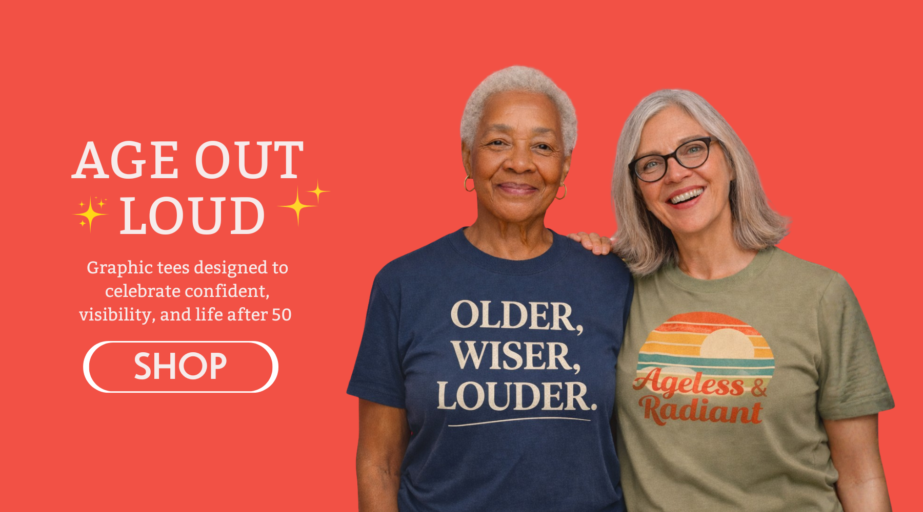 We ship everywhere—because women are aging out loud on every continent. Shipping rates depend on where you're located, so check our shipping policy for the details that apply to you. Wherever you are, we'll get our message (and your new favorite tee) to your door.