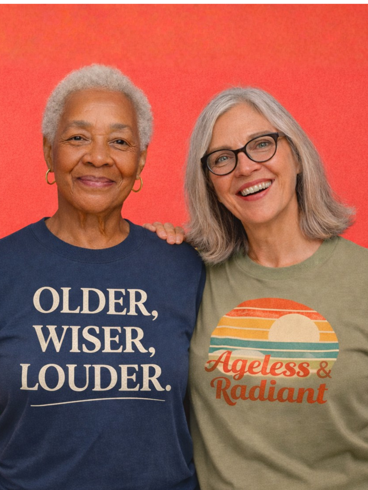 We use high-quality, comfortable materials for all our tees—soft enough to live in, durable enough to make a statement repeatedly, and gentle on skin that's earned the right to be treated well. Exact materials vary by item, but you'll find all the details on each product page. Because at 50+, comfort isn't negotiable—and neither is quality.